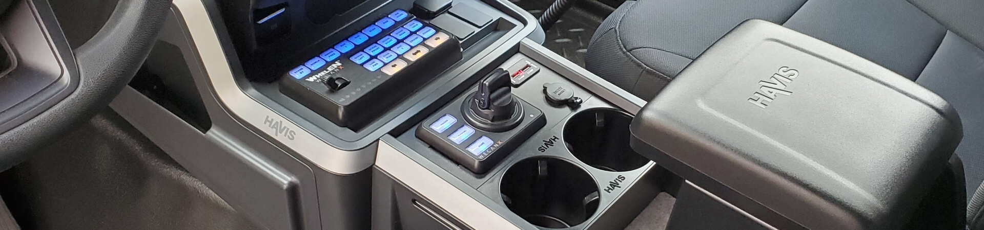 Havis tiene una línea completa de consolas y accesorios de montaje, incluidos bolsillos para accesorios, reposabrazos, portavasos, soportes para equipos, placas de relleno, soportes para reubicación de radio, luces para mapas, interruptores, soportes para micrófonos y más.